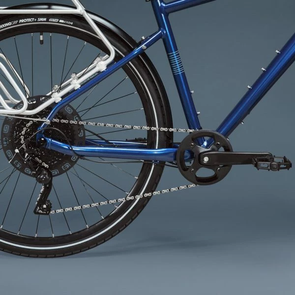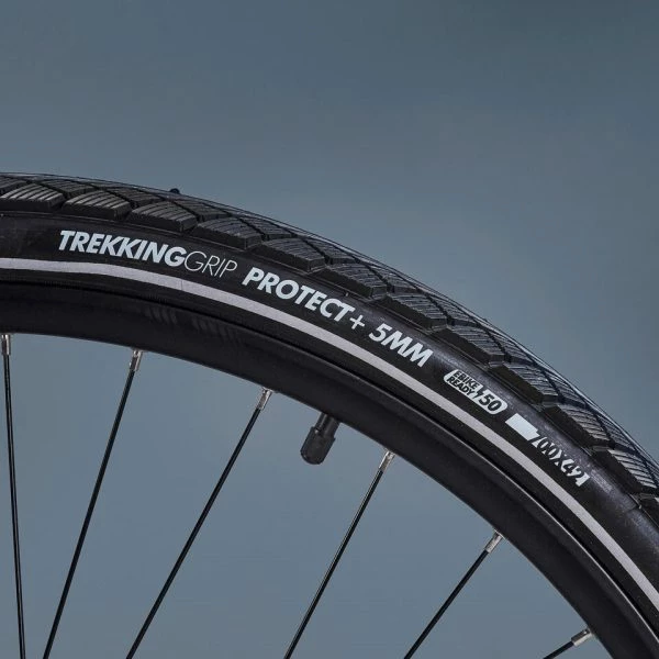 Nous avons choisi des pneus Btwin Trekking 9 Grip Protect+. Des pneus résistants à la crevaison grâce à leur bande anti-crevaison épaisse de 5mm en élastomère. Une accroche aussi efficace sur route que sur chemin, pour être à l’aise sur tous les terrains.